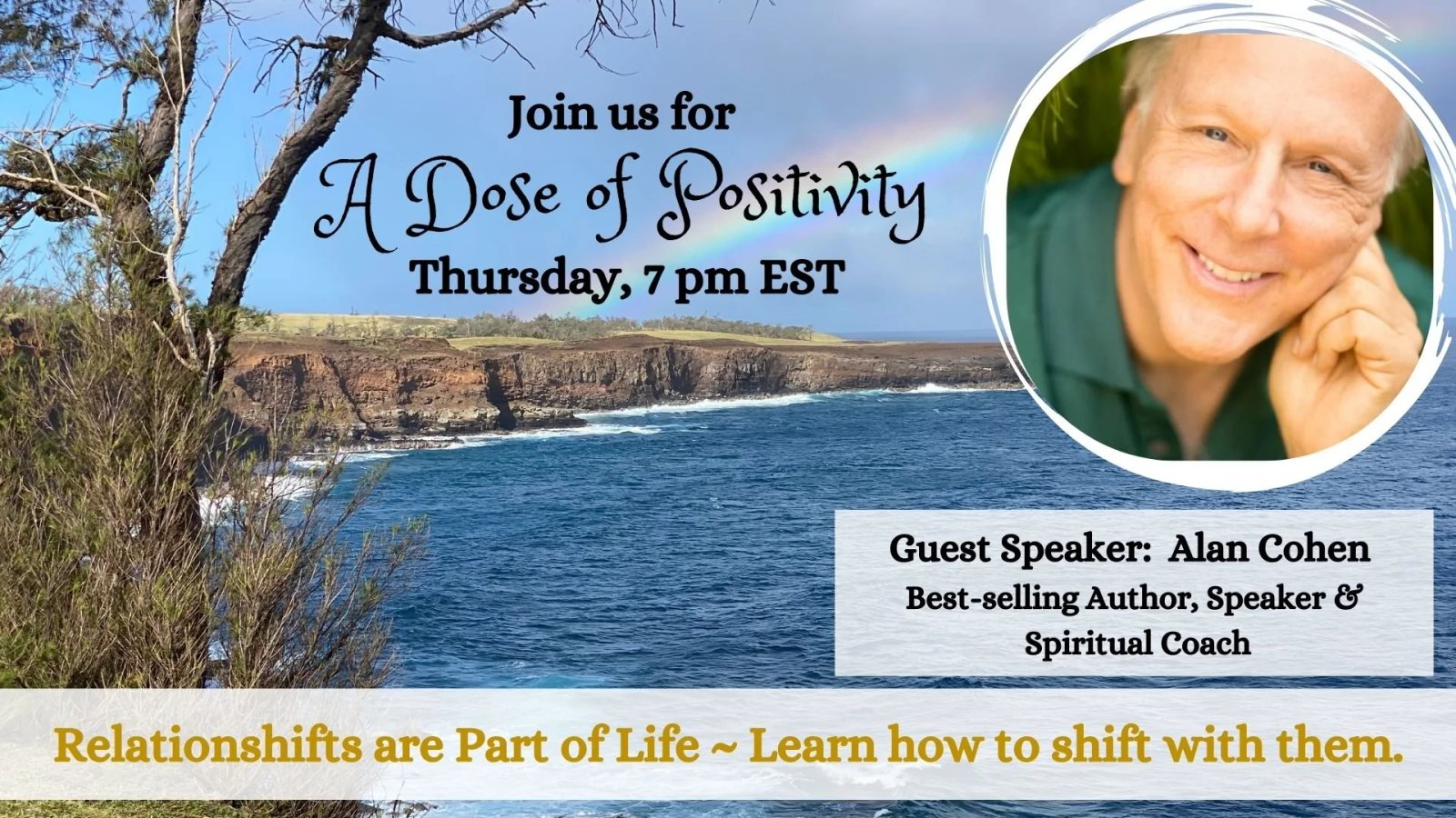 Join us for a weekly uplifting discussion every Thursday at 1 pm Hawaii time, 4 pm PST, 7 pm EST.