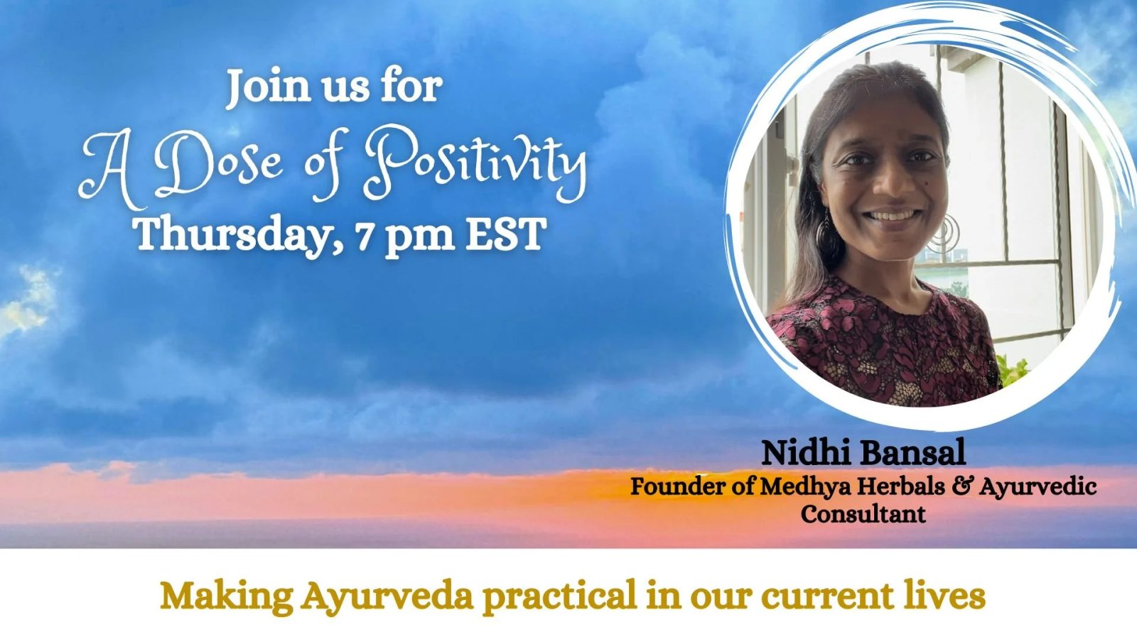 And on this week’s Dose of Positivity, I’m excited to share with you our guest speaker, Nidhi Bansal who is bursting with enthusiasm to share her deep-rooted passion for Ayurveda with you through this platform. Her excitement is contagious, and you'll find yourself eagerly diving into the world of Ayurveda with her.