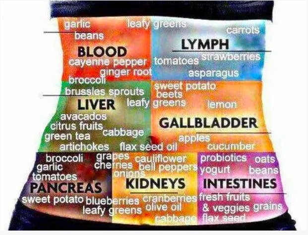 This diagram offers us suggestions on what to eat for particular parts of our body. I have been eating a lot of grapes, blueberries, cauliflower, and red peppers. An Ayurvedic, renal diet. My kidneys are happier.
