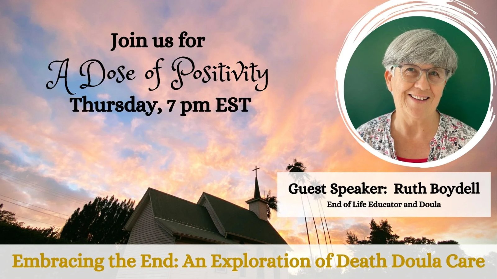 Over the past few months, the opportunity to interview several professionals who work in the end-of-life field has been an enriching experience. Learning about the different aspects of the living to dying to death phases from various perspectives has been fascinating. I am thrilled to announce this week that Ruth Boydell, an End of Life Educator and Doula, will join me on A Dose of Positivity for a live broadcast. I am honored to have the chance to speak with her and gain further insight into the valuable work she does. Please join us.